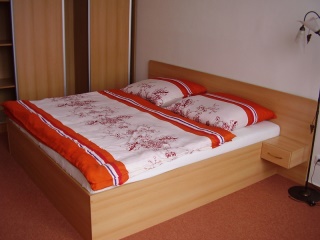 Dvoulůžko s čelem a zabudovanými nočními stolky. Cenu zkalkulujeme na požádání dle vybraného materiálu.