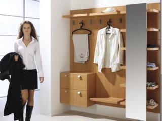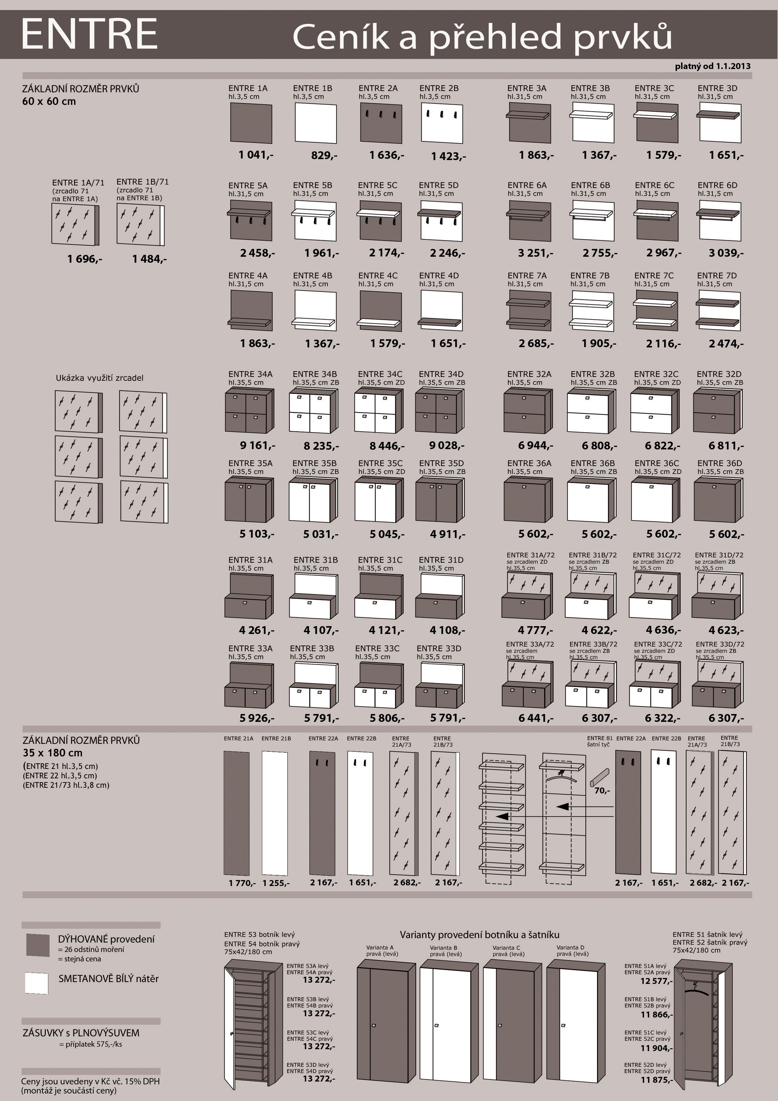 Předsíňový nábytek Entre je vyráběn z dýhy v různém barevném provedení. Jednotlivé prvky, které mají tvar čtverce lze dle potřeby kombinovat. Celá sestava je zavěšována na kovovou konstrukci, která je napevno připevněna ke zdi.